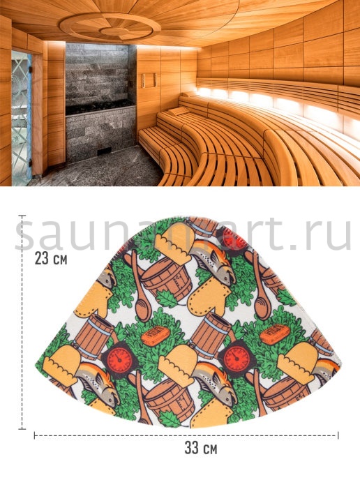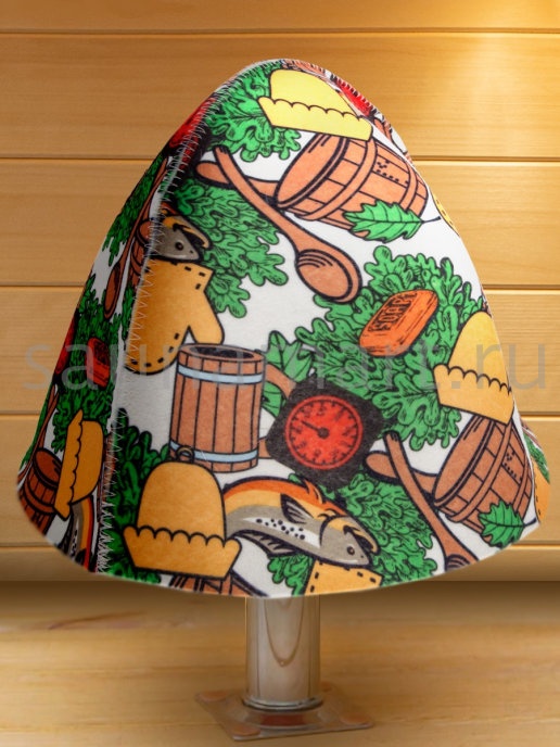 Шапка это необходимый атрибут для похода в баню или сауну. Высокая температура и сухой воздух в парной могут вызвать перегрев и ожоги кожи головы. Шапка для бани убережет голову, уши и волосы от высокой температуры и перегрева. Если пренебрегать защитой головы с помощью шапочки, то волосы теряют влагу и становятся ломкими и сухими. Помимо термоизоляционных свойств банная шапка обладает отличными гигроскопичными свойствами - прекрасно впитывает влагу и пот, что сделает Ваше пребывание в парной более комфортным. Головной убор для бани выполнен из натурального материала – войлок. Материал достаточно пористый, за счет чего создает своеобразный защитный барьер  по принципу термоса, для изоляции от высокой температуры. Стильный, яркий, необычный рисунок выделит Вас и подчеркнет Вашу индивидуальность. После применения расправьте шапку и просушите. Размер универсальный. Мы предлагаем Вам не только эффективное  средство защиты от перегрева, но и стильный яркий аксессуар для бани и сауны.