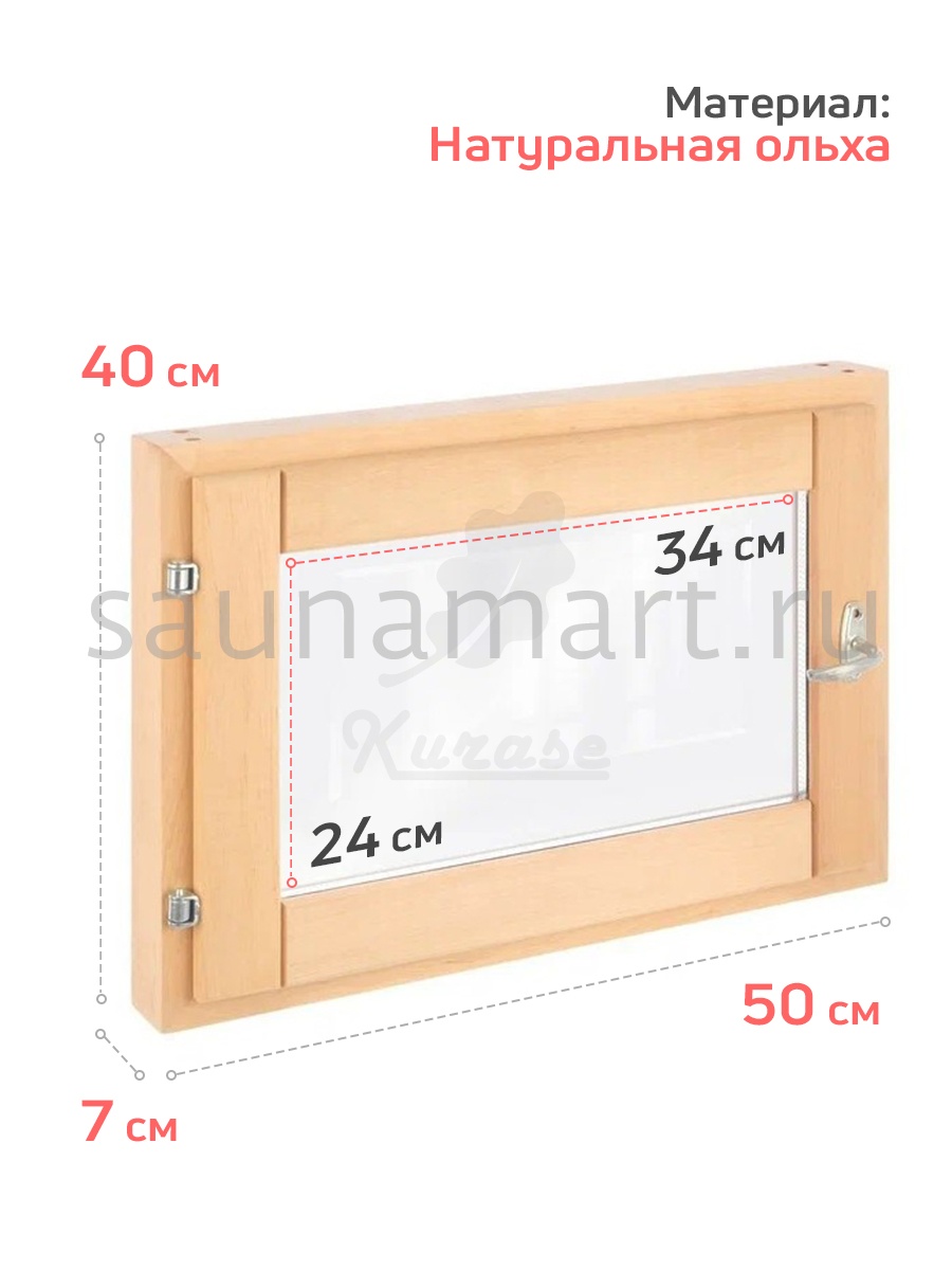 Окно для бани из ольхи. Форточка для бани в ассортименте 40х50, 40х40, 30х40 см. Однокамерный стеклопакет. Окошко из прозрачного стекла. Деревянная рама с фурнитурой в комплекте: петли, ручка и затвор. Банное остекление готово к установке нужно только прикрутить ручку. Маленькое окно в парилку снижает теплопотери, обеспечивает проветривание, вентиляцию и поступление дневного света. Деревянное окно необходимый атрибут в русской бане, как дополнение к системе воздухообмена. Одновременное открытие банной двери и окна образует сквозняк, позволяющий обеспечить тщательное проветривание, для сохранности и долговечности внутренней отделки стен, пола, потолка, печи и полок в бане. Оконная рама из лиственных пород, не выделяющих смол, прекрасно переносит условия высокой влажности и температуры, демонстрируя: влагоустойчивость, устойчивость к гниению и образованию грибка. Деревянная форточка может быть использована для строительства и ремонта гаража, дачного туалета и душевой, дачного домика.