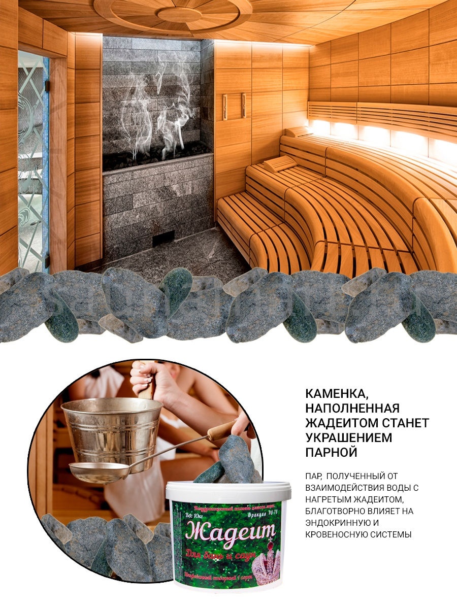 При контакте с водой, жадеит выделяет небольшое количество метакремниевой кислоты, тем самым, наделяя получающийся пар целебными свойствами. Посещение парной, где используются эти полудрагоценные камни, окажет положительный эффект на Вашу кожу, кровеносную систему и общее самочувствие. В случае, если Вы применяете лекарственные препараты, в особенности, созданные на травяной основе, их действие усилится после посещения парной с камнями из жадеита.
