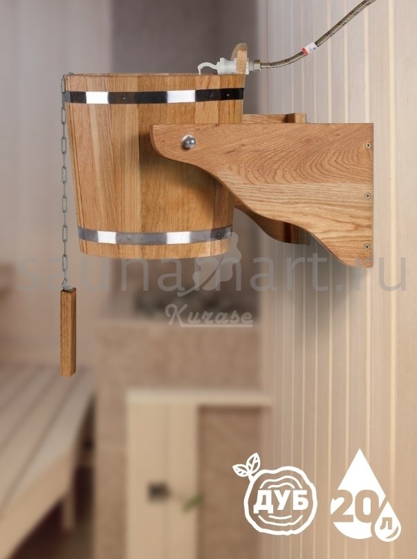 Обливное устройство для бани и сауны. Объем 20 литров. Материал изготовления - древесина дуба. Внутренняя вставка из нержавеющей стали предотвращает появление грибка и ржавчины.