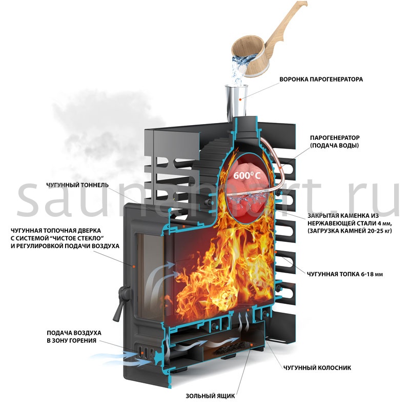 Преимущество печей ASTON: Конструкция разработана для максимальной тепловой эффективности при минимальном расходе ресурсов - времени и топлива. Каменка и корпус имеют скошенные поверхности, что обеспечивает свободное движение дымовых газов без образования "дымовых карманов". Такая геометрия позволяет всем частям печи прогреваться равномерно как по температуре, так и по времени, обеспечивая полное сгорание топлива и быстрый результат.