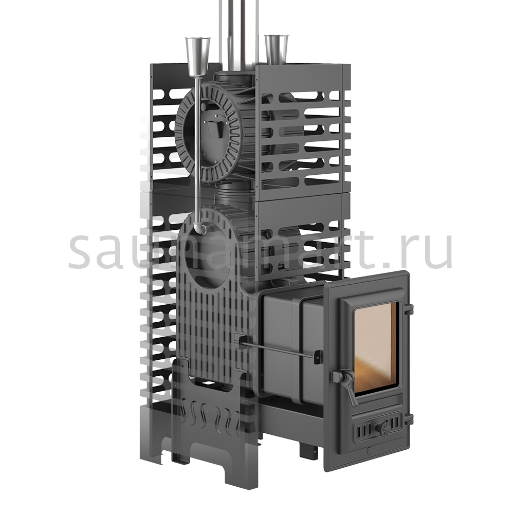 Комплект состоит из чугунной банной печи Астон Шторм 18 и чугунной натрубной каменки Турбопар. Объединение двух конструкций в единую систему заметно увеличивает тепловую отдачу термоагрегата, предотвращает перегрев дымохода, организует дополнительную каменку для получения качественного пара.
