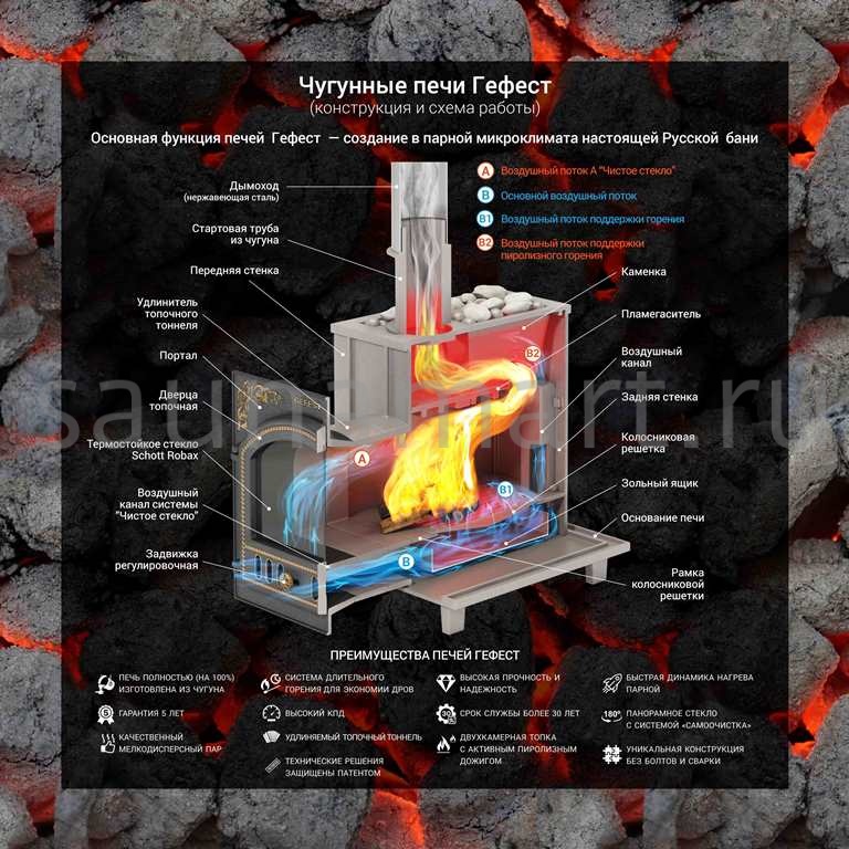 Чугунная банная печь «Гефест 35 (П)» обладает высокой эффективностью и надежностью благодаря конструкции из легированного чугуна с толщиной деталей до 40 мм. Печь предназначена для русской бани и оснащена двухкамерной топкой с системой дожига пиролизных газов, что обеспечивает качественный мелкодисперсный пар и топливную экономичность.