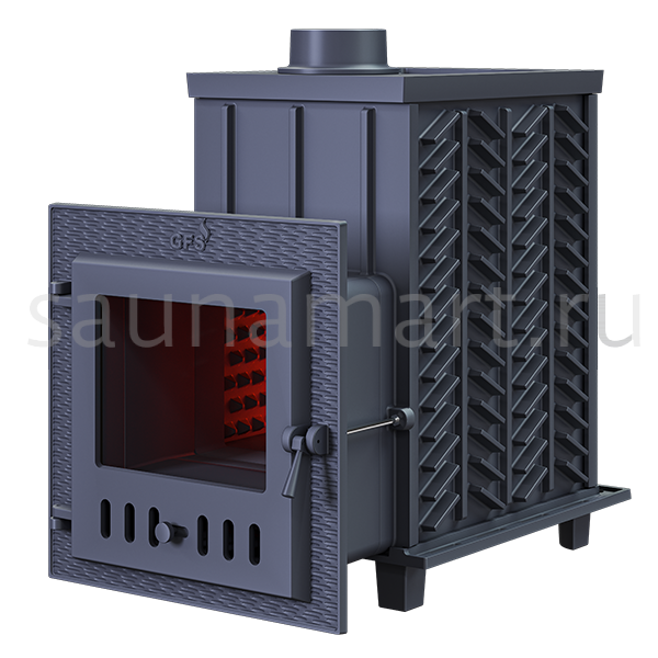 GFS-ЗК 30 (М) — это печь с усиленной каменкой большей массы, с единым углублением внутрь топки для дополнительной укладки чугунного заряда. Теплосъемные шипы, со стороны горения пламени, в разы увеличивают площадь соприкосновения огня с каменкой и ускоряют передачу тепла, а также способствуют лучшему дожигу, смешивая потоки пламени и воздуха, поступающего из воздушника. Эти усовершенствования значительно повышают мощность парообразования печи и выдают большее количество пара при непрерывной подаче воды. Каменка печей GFS-ЗК является незаливаемой.