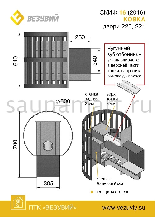 Преимущество печи Скиф заключается в использовании конструкционной стали толщиной 6-8 мм, наличии чугунного зуба отбойника, чугунной топочной двери и колосниковой решётки, а также в конвекционно-вентилируемом кожухе «СЕТКА», способном вместить до 130 кг камней, что обеспечивает долгий срок службы до 10 лет.