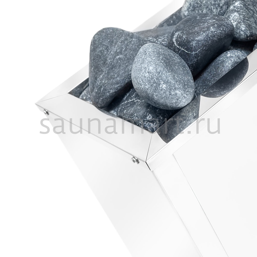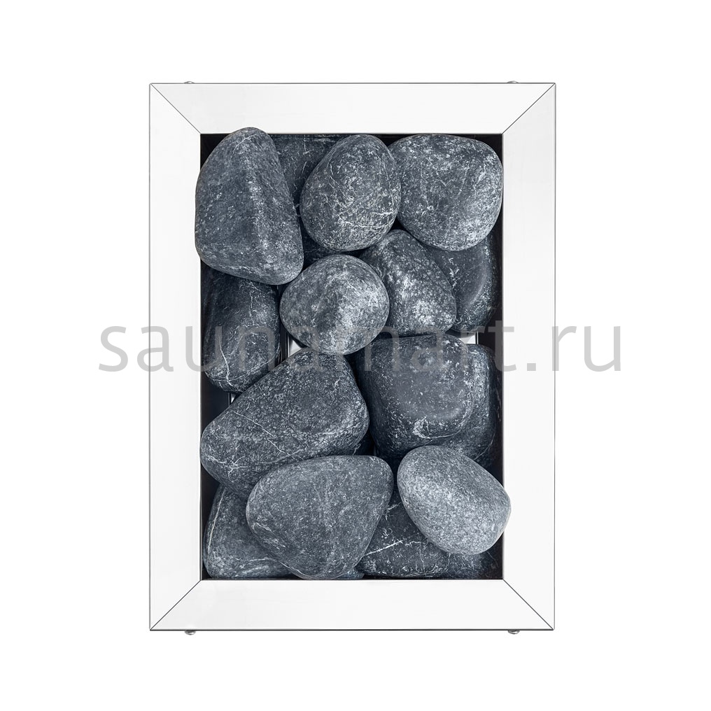 Представленная модель электрокаменки имеет отсек для камней, который вмещает до 15 кг. Она монтируется напольно.