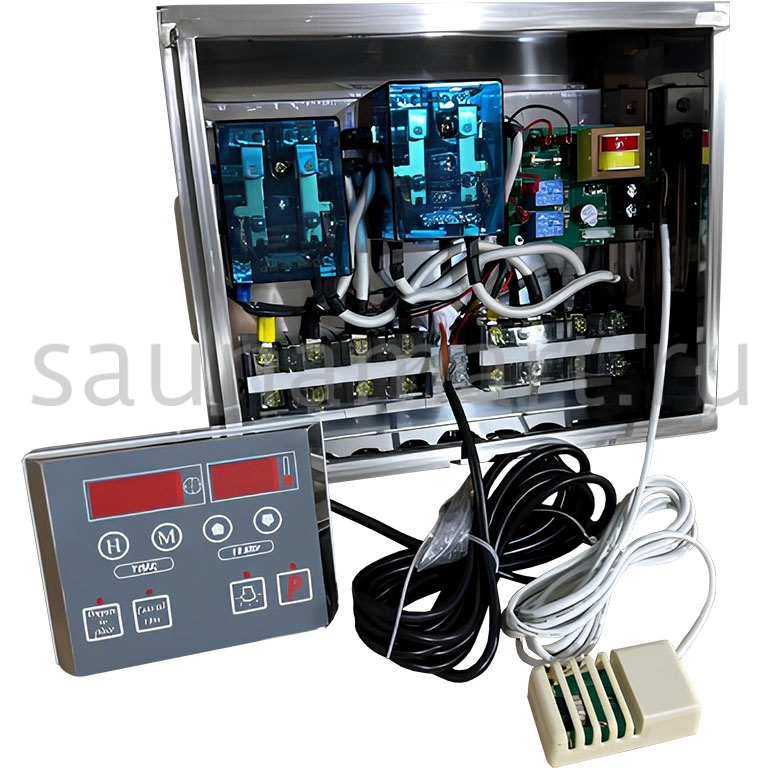 Пульт управления элeктрoкaмeнкой (электропечью для сауны) ПУЭКМ "Ресурс" цифровой программируемый до 36 кВт включительно. Пульт устанавливается в предбаннике, а датчик заводится в парилку. Длина кабеля с датчиком температуры 3 метра. Датчик с кабелем идут в комплекте с пультом.