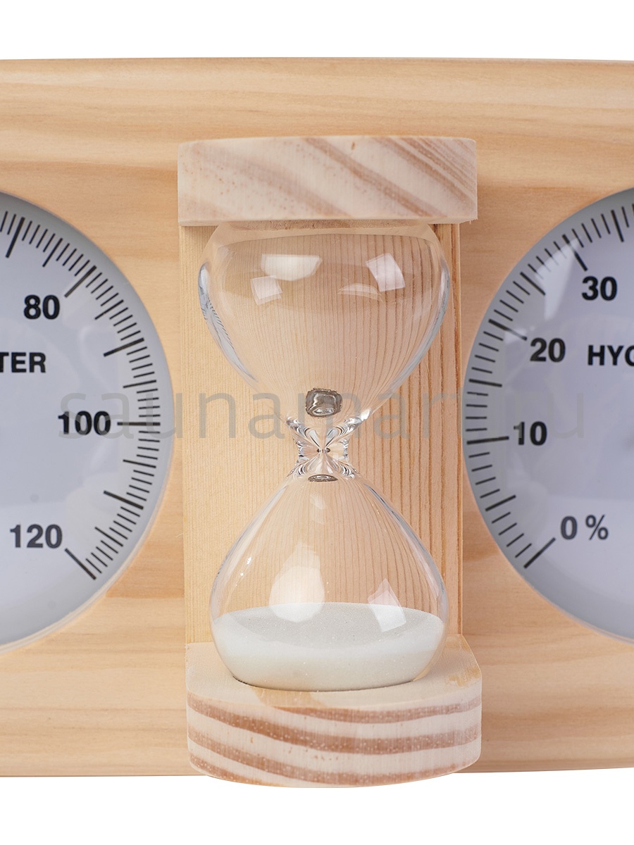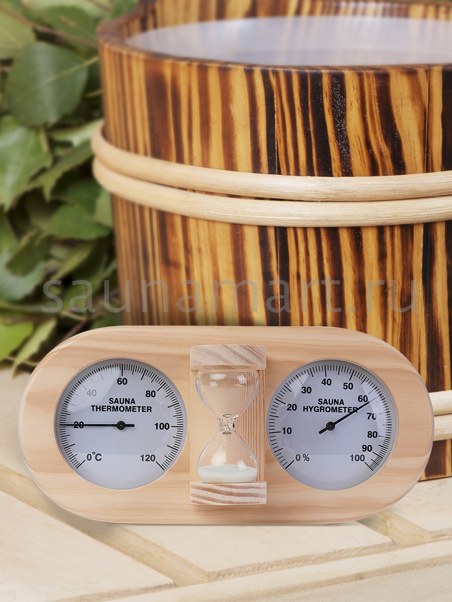 Термогигрометр со встроенными песочными часами 3 в 1 это товары для бани и сауны, - универсальные аксессуары для обустройства бани, которые создают уют, комфорт, удобство и особенную атмосферу в парилке русской бани. В широкой раме из дерева находятся два круглых циферблата под термостойким стеклом: термометр и гигрометр. Градуировка шкалы гигрометра варьируется в пределах от 0 до 100 %. Градуировка шкалы термометра варьируется в пределах от 0 до 120 градусов по Цельсию. Предусмотрена возможность калибровки измерительного прибора. Между циферблатами располагаются песочные часы для бани, рассчитанные на 15 минут. Это идеальное время нахождения в парилке. Банный аксессуар не боится высокой влажности и температуры, поэтому идеально подходит для использования в любом парильном помещении, как в условиях русской бани, финской сауны так и хамама. Предназначен для настенного размещения. Помните, чтобы проведённое в парной время оказало благоприятный эффект на здоровье и самочувствие, необходимо тщательно соблюдать температурный режим парения, режим влажности и длительности пребывания в парной. Не подвергайте прибор ударам и падению. Упаковано в картонную коробку. Все банные принадлежности нужно выбирать тщательным образом. Представленный банный аксессуар изготовлен из экологичного сырья и прошел все этапы сушки и обработки. Банная метеостанция станет прекрасным подарком для банщиков, отца, мамы, дедушки, мужа, сына, внука, друга, брата, которые любят русскую баню. Эта стильное интерьерное решение подойдет еще и для ванной комнаты и балкона.